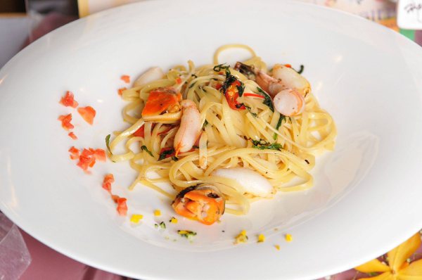 大蒜片20g 紅辣椒片15g 蟹腿肉20g 草蝦60g 淡菜30g 番茄丁10g 洋蔥丁5g 黑橄欖丁3g 小黃瓜丁3g 坎佩尼亞細扁麵60g 白酒100c.c. 羅勒葉15g 橄欖油30g 綜合香料5g 鹽、胡椒適量 |
