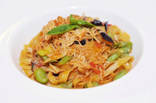 1. 蟹肉蒸熟後取肉。 2. 水滾煮麵約12分。 3. 爆香蒜碎,加入蟹肉,高湯,鮮奶油略煮調味。 4. 放入坎佩尼亞寬扁麵翻炒。 5. 放入番茄丁,茄丁,豌豆,等蔬菜配料。 6. 加奶油起鍋後略加裝飾即可。 |
