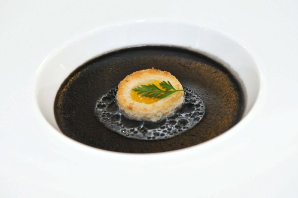 1. 爆香培根,加入洋蔥炒軟 2. 加入馬鈴薯略炒後,加入少許墨魚汁,蛤蠣汁 3. 主滾放涼打勻,回熱再調味 4. 白土司壓模,烘乾,放入鳥蛋黃,考成金黃 5. 蛤蠣汁加鮮奶,加熱打泡泡,裝飾即可