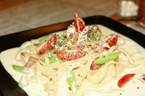 說著說著連續兩盤香噴噴熱騰騰的義大利麵上桌,我問這兩盤義大利麵是店裡的招牌嗎? 他說每一道都是招牌,我心想怎麼可能,王老闆接著說每一道麵都是他親自研究出來的特殊氣味,完全與目前市場上的口味不同(聽到這裡肚子又咕嚕咕嚕的叫了),像是「香蒜辣椒雞肉麵」的辣椒就是採用特製的辣椒產生非常特殊的香氣味,上頭的蒜頭要使用固定的油品、油溫、時間才有辦法炸出這樣的品質黃金蒜片。接著「奶油培根蛋黃麵」其中奶油與蛋黃醬是經過特殊溫度處理過再與CamPania細扁麵溶在一起,最後加入經過烘烤過的培根才完成。說到這裡感覺真是每一道都是招牌麵,此時終於可以開動了,先吃一口我愛吃的香蒜辣椒雞肉麵,那一片一片的黃金蒜片超香,又辣的夠勁,真是棒 !再試上一口我最不愛吃的奶油口味的奶油培根蛋黃麵,為什麼不愛吃呢?( 因為奶油吃多容易膩),吃了一口後,哇!真是難以言喻的感覺,口感真的是扎實,味道濃郁,吃了一口後絕對想接著一口。我只能說這是我吃過完全不會膩,非常爽口、化口性極佳的奶油麵,絕對不像一般奶油醬汁吃了幾口後就有吃不太下的感覺。王老闆說奶油醬是一家義大利麵的重點,如果每位客人吃久會覺得膩那真的有非常多義大利麵店要關門了,他們家的奶油麵一定要使用高品質、高熔點的奶油,最重要的是注意成型溫度,過與不及均不可。客倌們!一定要去吃吃看,絕對難忘。老闆接著說一盤義大利麵最重要的不只有新鮮與對時的食材還有精技的手藝,最重要的義大利麵體才是一道義大利麵的靈魂呢!!像他們使用CamPania的麵體口感就非常棒,是一個高品質的義大利麵。